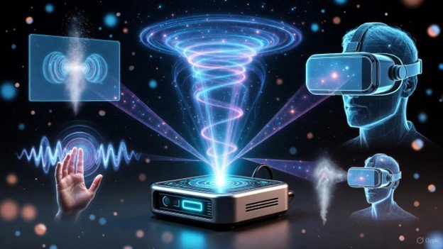 - Holographic projectors that create fully controllable magnetic light fields for immersive virtual reality, creating sensations of touch, smell, and physical presence